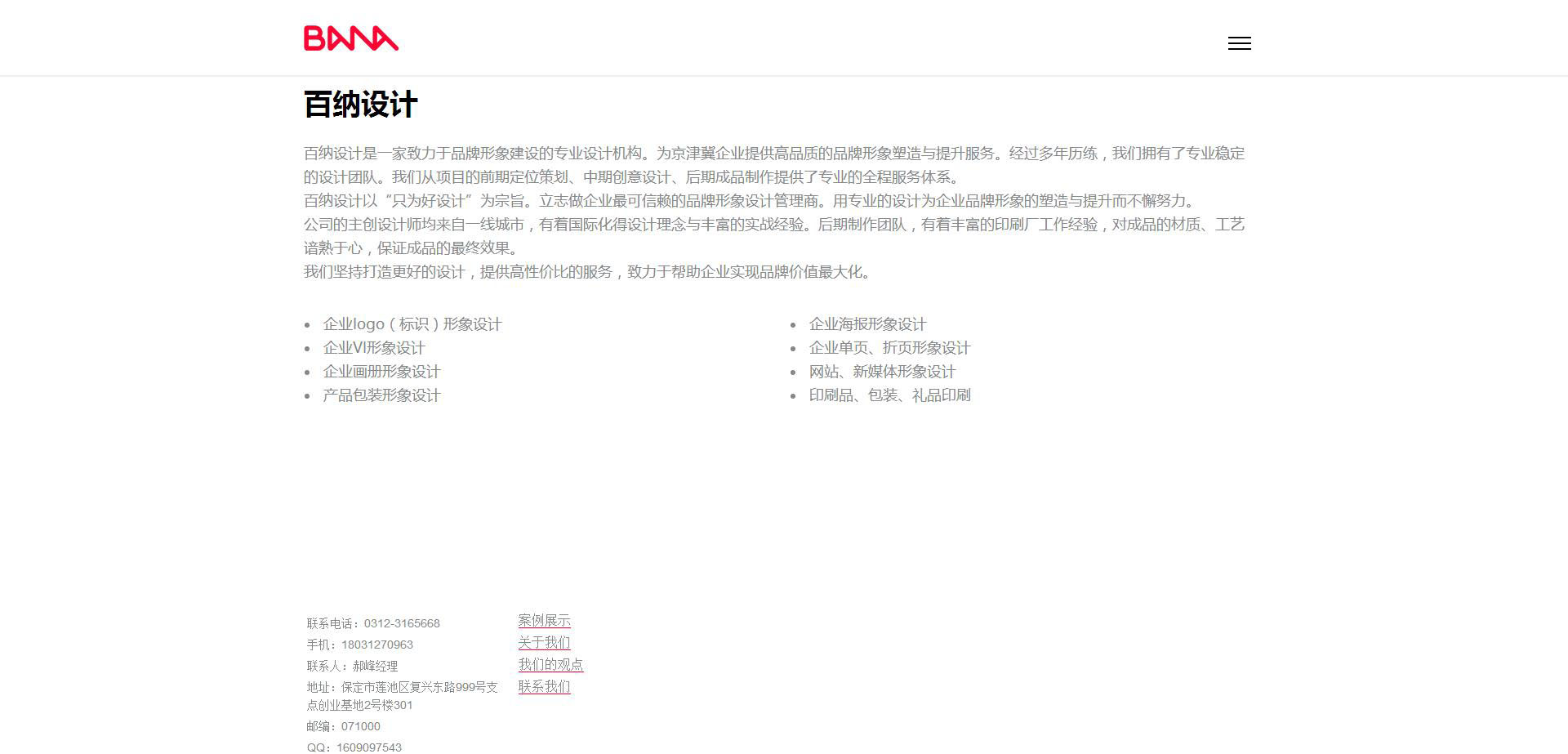 百纳设计是一家品牌形象建设的专业设计机构。通过其官网的搭建为京津冀用户搭建良好的互通了解渠道,同时传播其企业精神和设计团队。