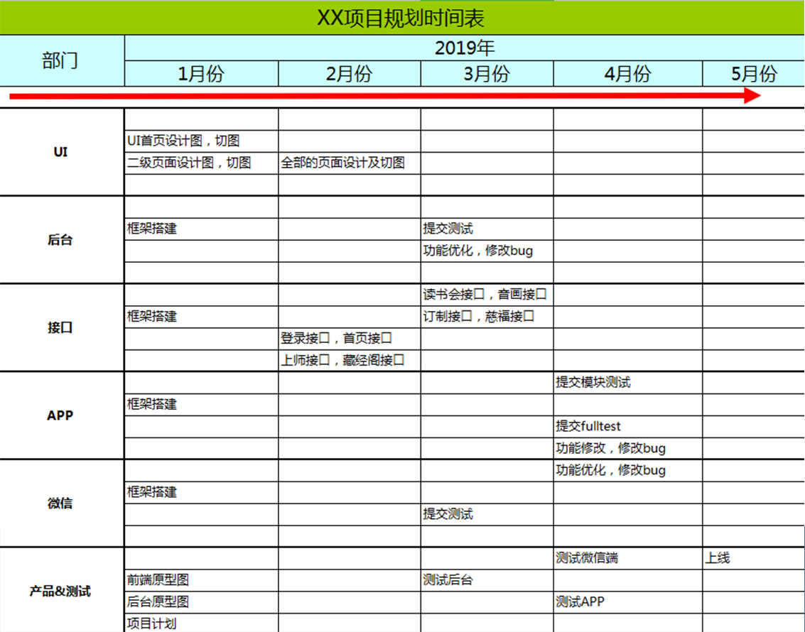 本阶段交付:项目时间规划表、程序实现流程图、概要设计文档、项目详细设计文档、数据库字典、交互字典,项目时间规划表如图所示: