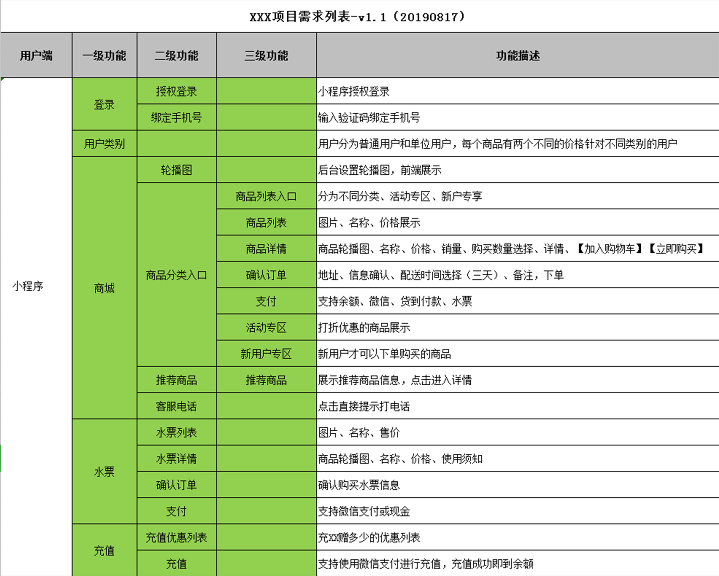 此阶段主要是根据客户前期提出的需求来进行整理,通过专业的需求分析,得出规范的需求表格,从而为整个软件项目的开发打下良好的基础,并且,我们会根据需求表格做出项目结构图和流程图。另外,在软件开发过程当中产品的需求可能会不断改变,我们也会根据需求变更的情况作出需求变更表以便对各种变化情况进行汇总和整理,保证项目的顺利进行。
