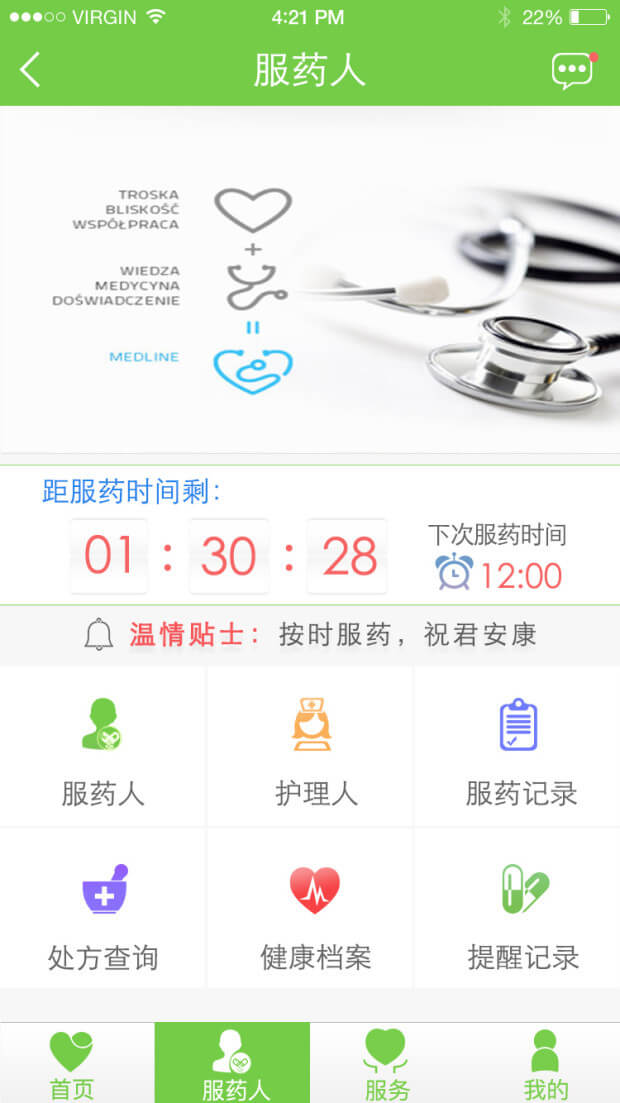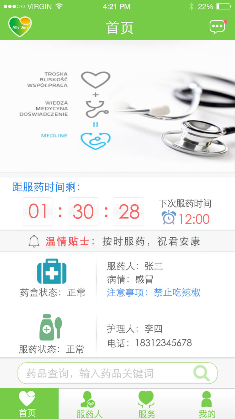 药帮手APP主要服务于需要服用药物的人群。APP中有服药时间提醒、药品数量监控、健康档案录入、实时监测健康状况等功能。同时APP中设有服药人和护理人这两大角色,其中护理人主要是监督和帮助服药人进行服药,以保障服药人及时安全的服用药物促进病情好转。护理人可以查看服药人的健康档案,随时了解服药人的身体状况,监督服药人按时吃药,防止服药人出现漏服、少服的状况。