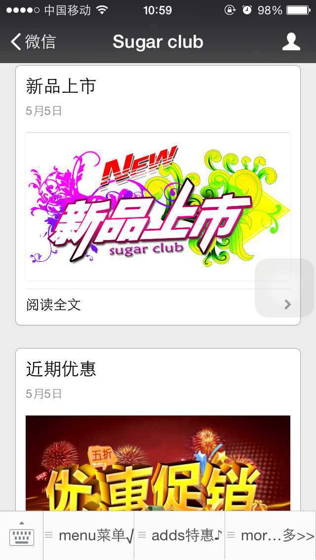Sugar club是微信公众平台刚面市的产物,产自2012年9月,平台实现商品在线预订,场地在线预订,店铺场景展示等功能,现在来看虽然已经很陈旧,但是对于公司发展与微信发展而言是有里程碑作用的一款项目。