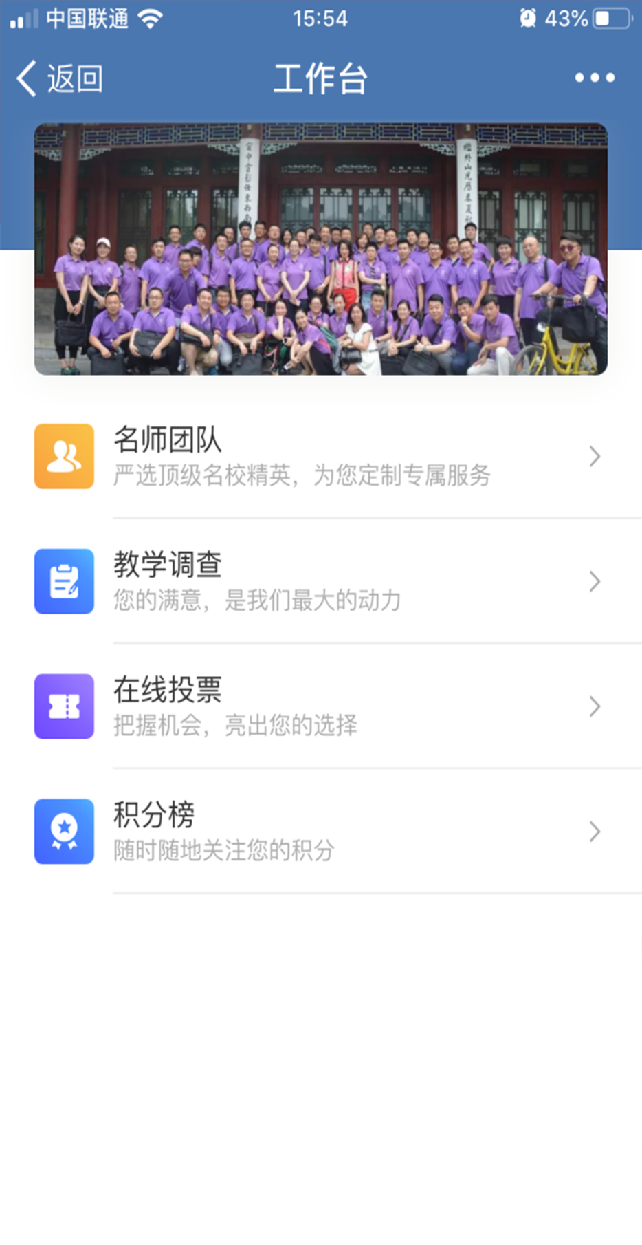 保定企业家协会会员管理系统是结合企业微信组织架构定制开发的线上会员系统,学员可线上查看名师团队简介,每节课后可对授课讲师进行评价打分,针对活动或者班委竞选直接线上匿名投票,各班委为每个学员登记积分并支持查看积分明细以及积分排行榜。