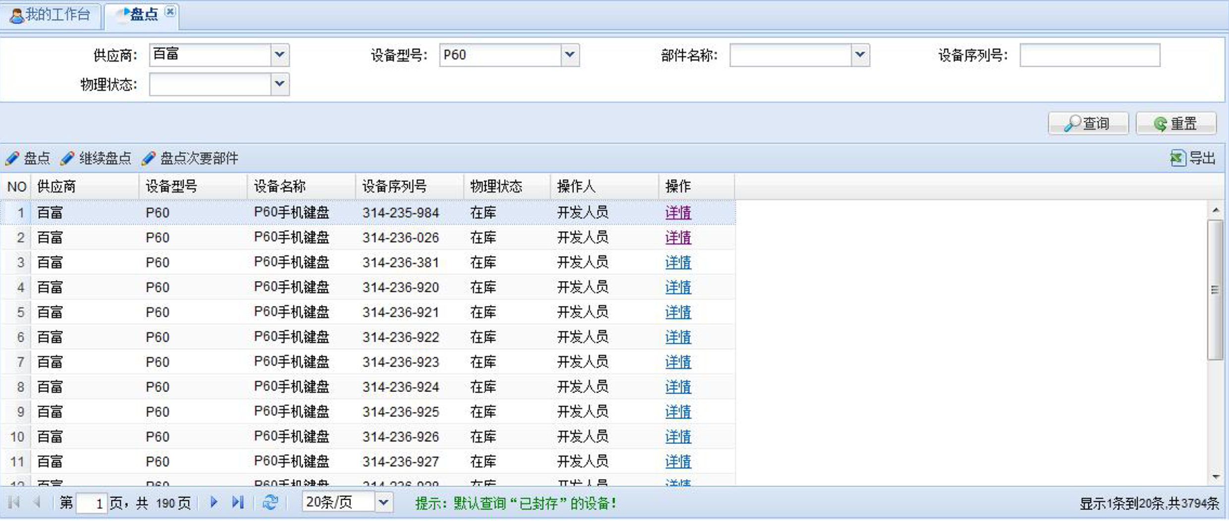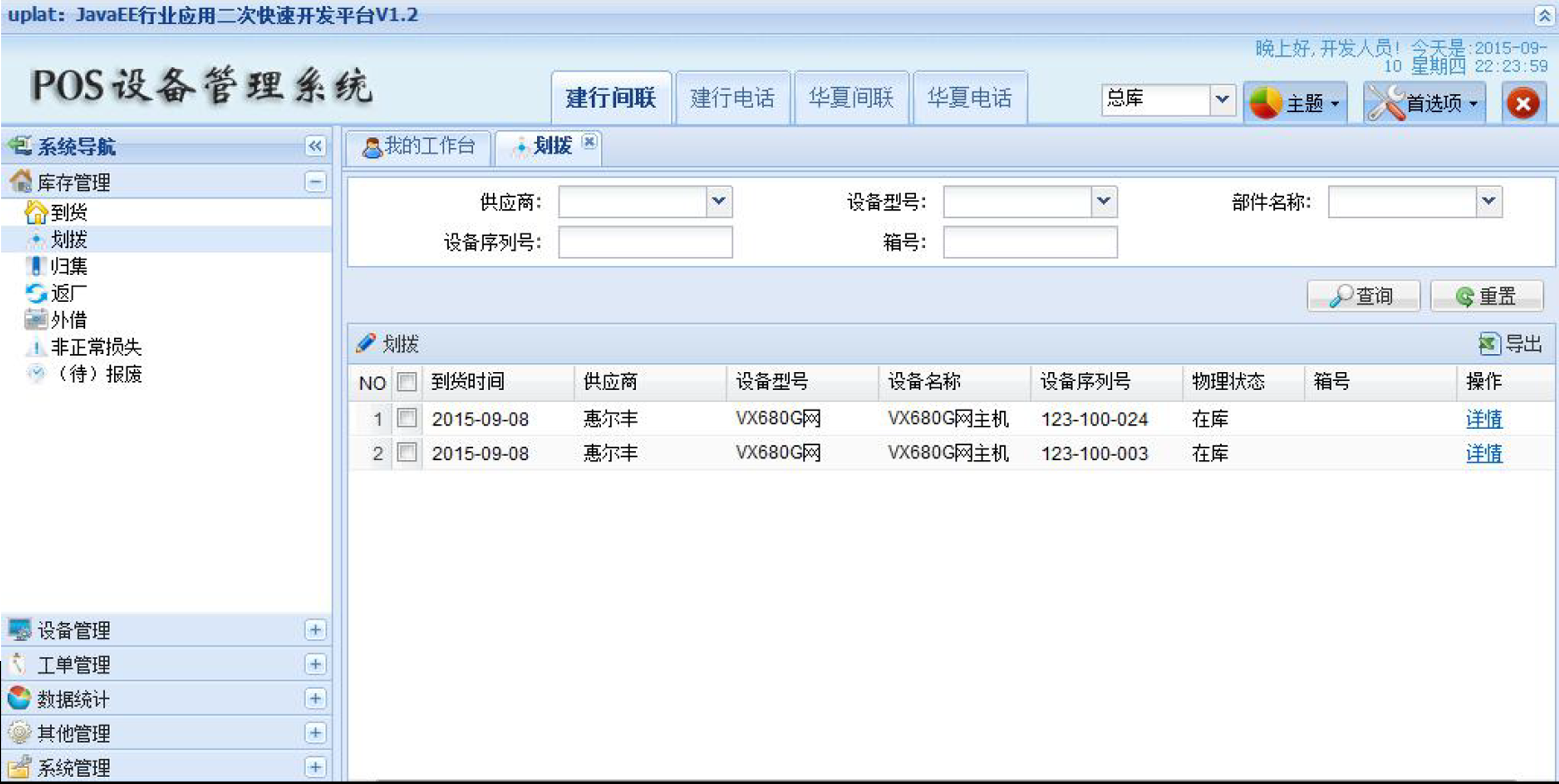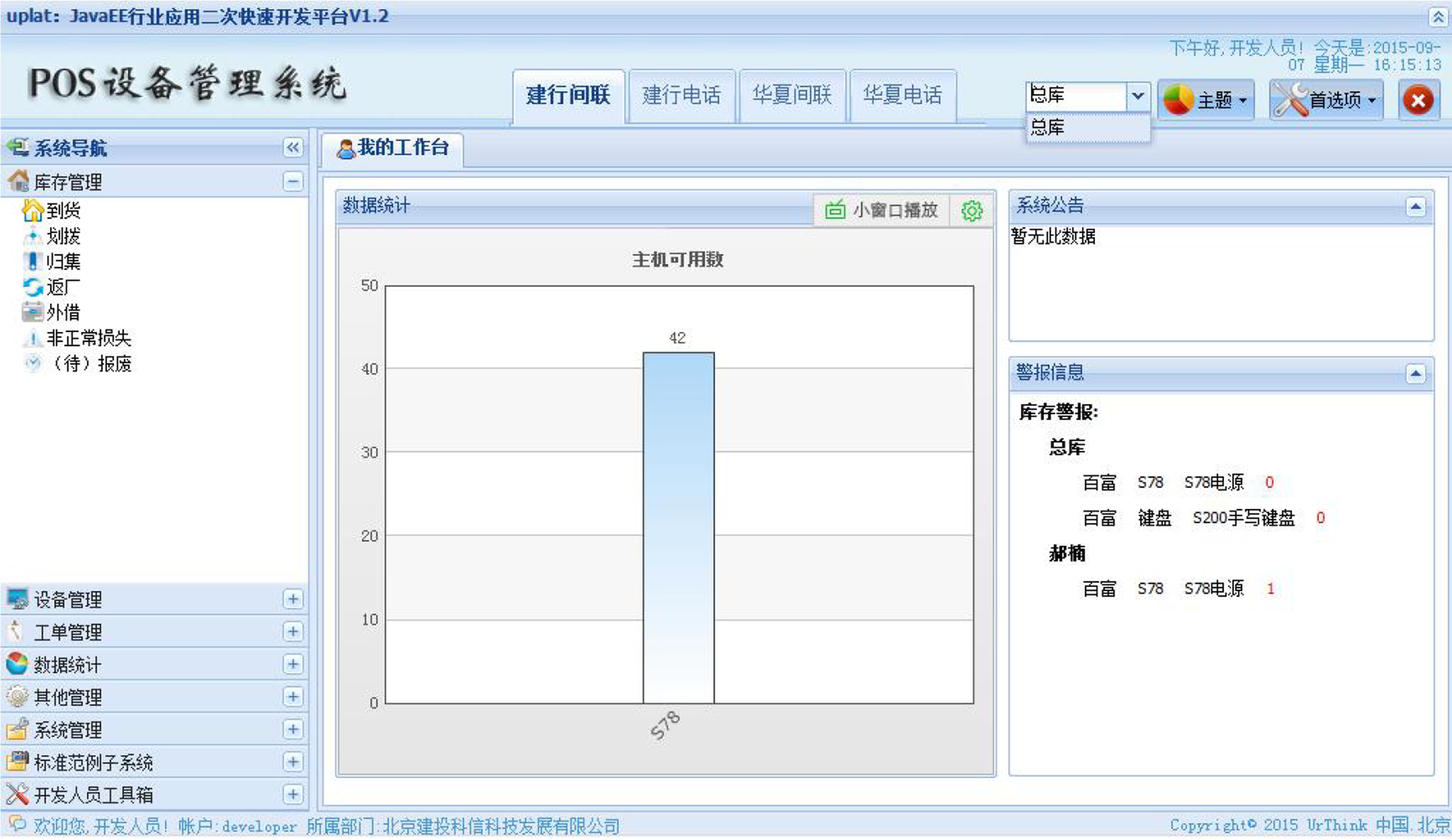 建投POS设备管理系统,是由我司在职技术人员为北京建投科信科技发展有限公司量身订制开发的一款公司内部使用的POS机设备出入库管理系统,主要用于业务部门高效管理自己的设备库存,系统信息的发布、数据的统计及维护,不同角色的用户管理相关权限下的信息等。