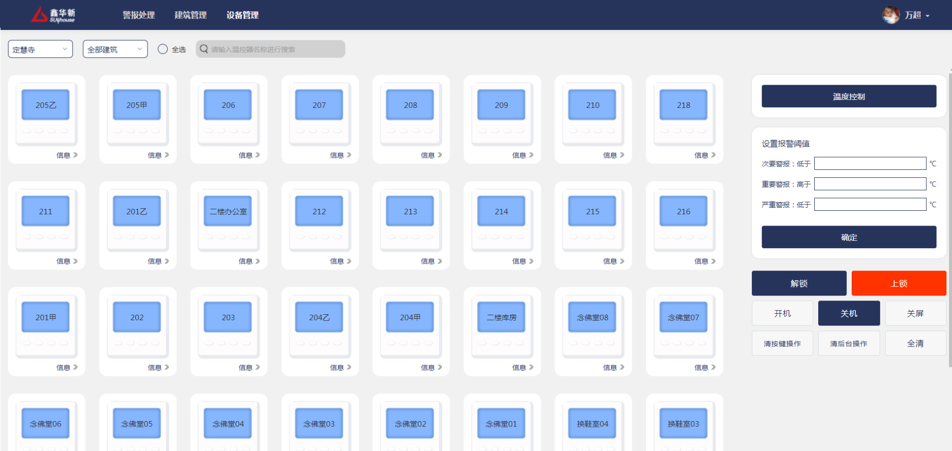 鑫华新温控项目是一款热力管理系统,管理员可以在线上管理温控器与建筑以及房间的绑定关系,远程控制每一个温控器的模式、温度以及其他面板上可以实现的操作,查看每一个温控器的历史及实时温度数据,当温度异常可实时收到警报以便及时处理。