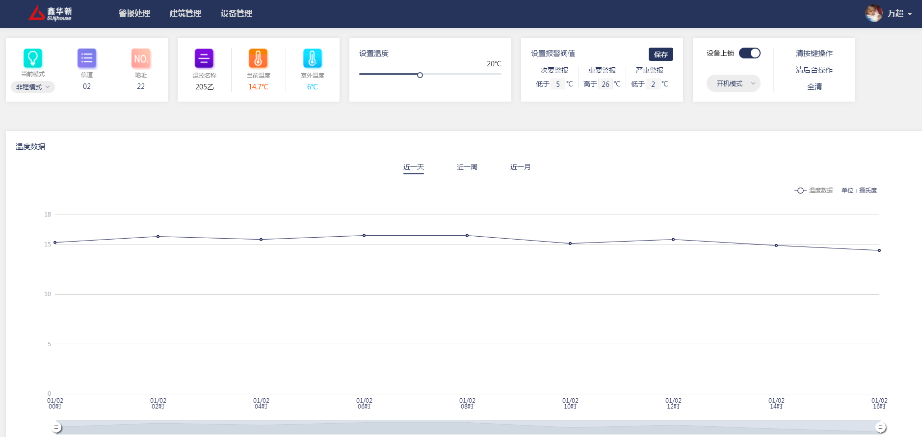 鑫华新温控项目是一款热力管理系统,管理员可以在线上管理温控器与建筑以及房间的绑定关系,远程控制每一个温控器的模式、温度以及其他面板上可以实现的操作,查看每一个温控器的历史及实时温度数据,当温度异常可实时收到警报以便及时处理。