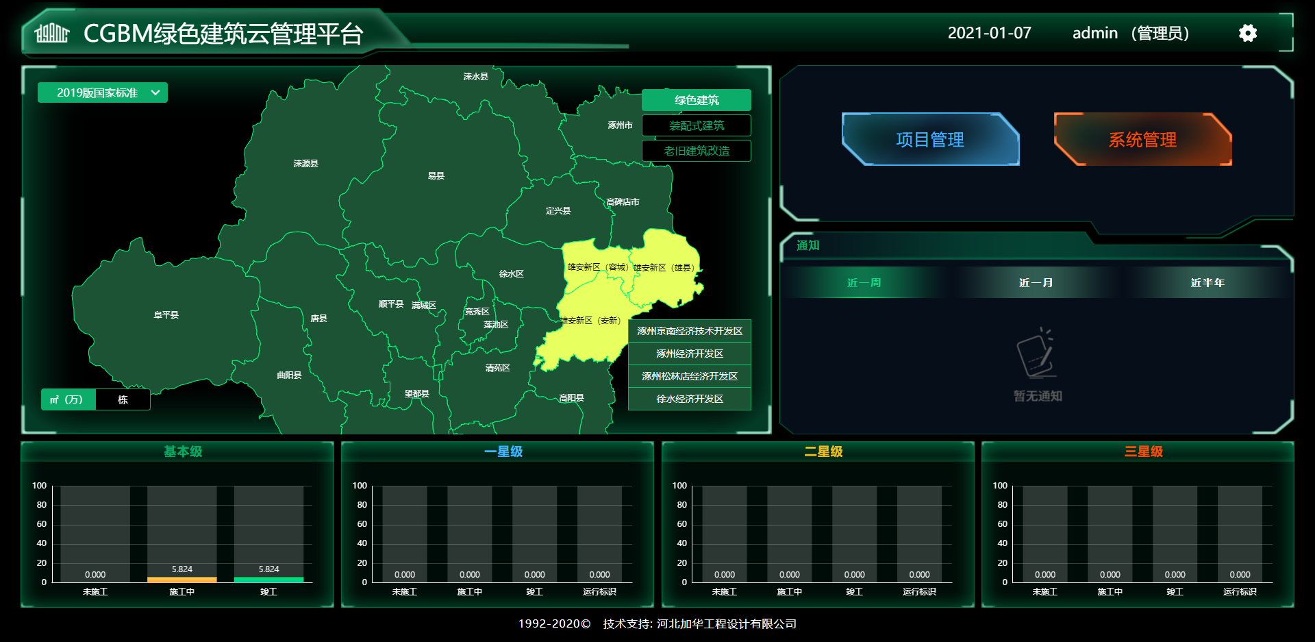 CGBM是绿色建筑评价系统大数据方面的汇总和管理端软件。CGBM基于CGBA系统全部数据总汇至CGBM首页,可查看全部绿色建筑的类型、省份、开工信息、竣工信息,可由多级管理人员进行流水线形式的是否同意、开工等操作,并总汇为地图和图表。